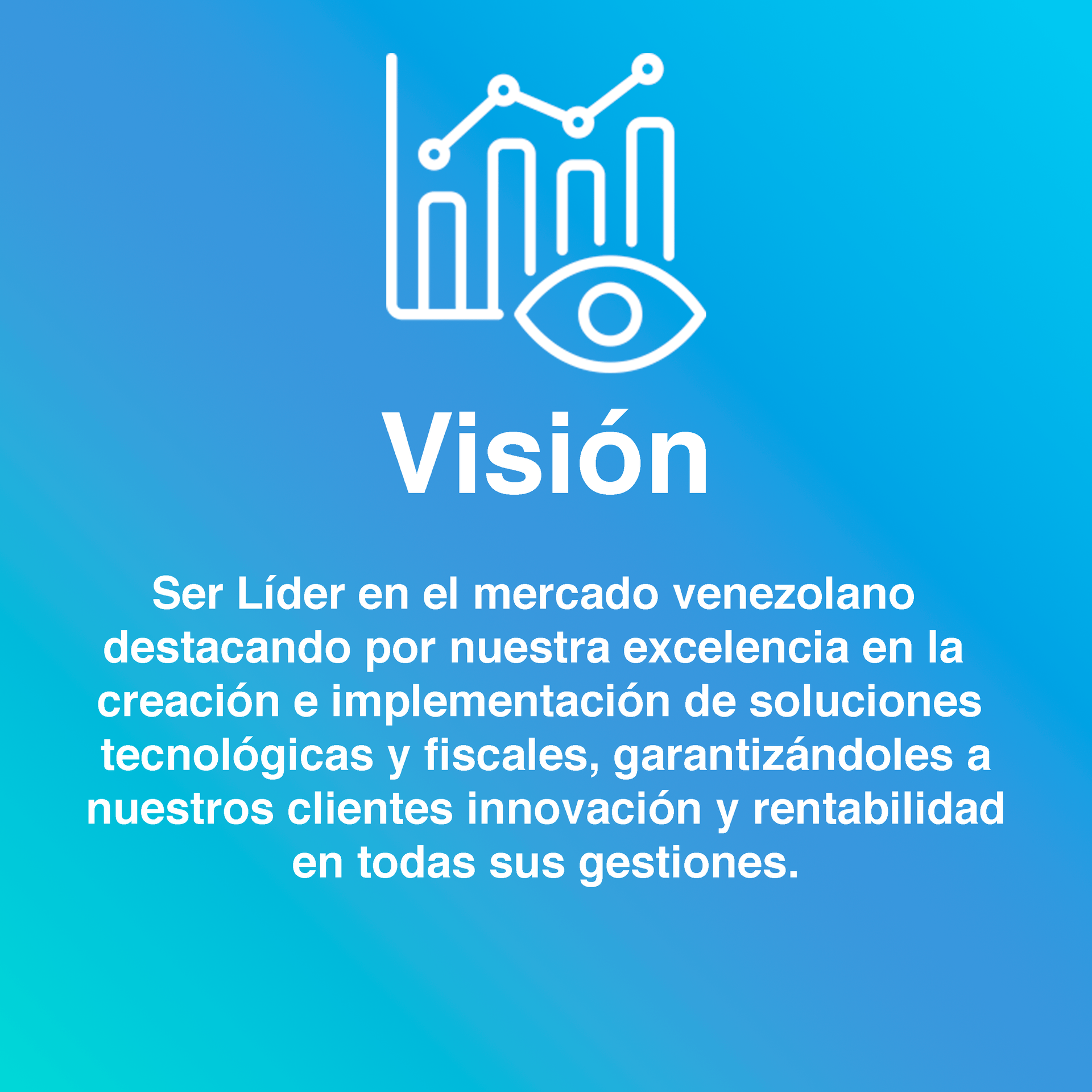 Ser Líder en el mercado venezolano destacando por nuestra excelencia en la creación e implementación de soluciones tecnológicas y fiscales, garantizándoles a nuestros clientes innovación y rentabilidad en todas sus gestiones.